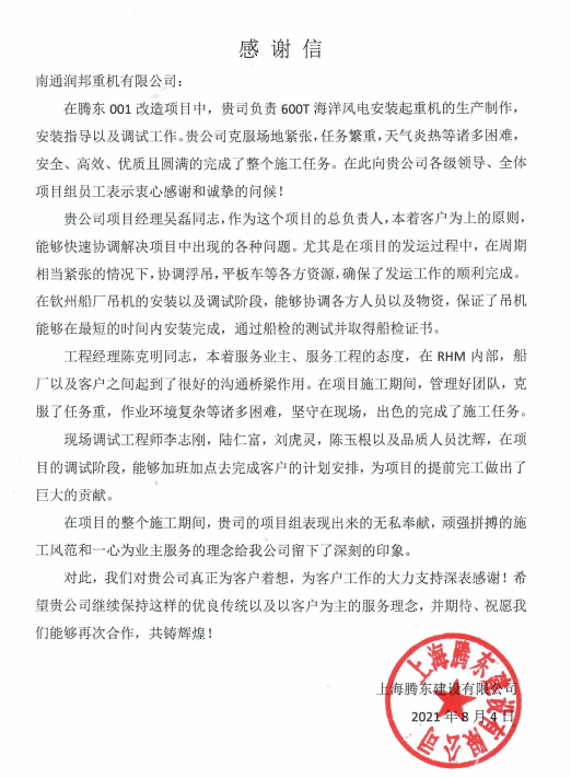 近日,子公司潤邦重機(jī)收到一封來自上海騰東建設(shè)有限公司的感謝信。騰東公司在信中對GENMA項目團(tuán)隊無私奉獻(xiàn)、頑強(qiáng)拼搏的施工風(fēng)范和客戶至上的服務(wù)理念給予了高度肯定和表揚(yáng)。 “騰東001”是一座專業(yè)用于海上風(fēng)電安裝的作業(yè)平臺。潤邦重機(jī)為該項目提供了一臺GENMA 600噸全回轉(zhuǎn)海洋起重機(jī),同時為該設(shè)備的安裝指導(dǎo)和調(diào)試工作提供了全面的技術(shù)支持。在項目施工過程中,潤邦重機(jī)項目團(tuán)隊克服了場地緊張、任務(wù)繁重、天氣炎熱等困難,最終安全、高效、優(yōu)質(zhì)且圓滿的完成了整個施工任務(wù)。