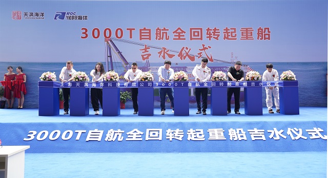6月6日13點18分,由子公司潤邦海洋承建的上海天沨“3000噸自航式全回轉起重船”吉水儀式在潤邦海洋船臺隆重舉行。上海天沨總經理周鋒先生,中國船級社張洪村先生,潤邦股份董事長龍勇先生、潤邦海洋執行董事施曉越先生、總經理邵夕吾先生等領導出席了吉水儀式,共同見證這一重要時刻。