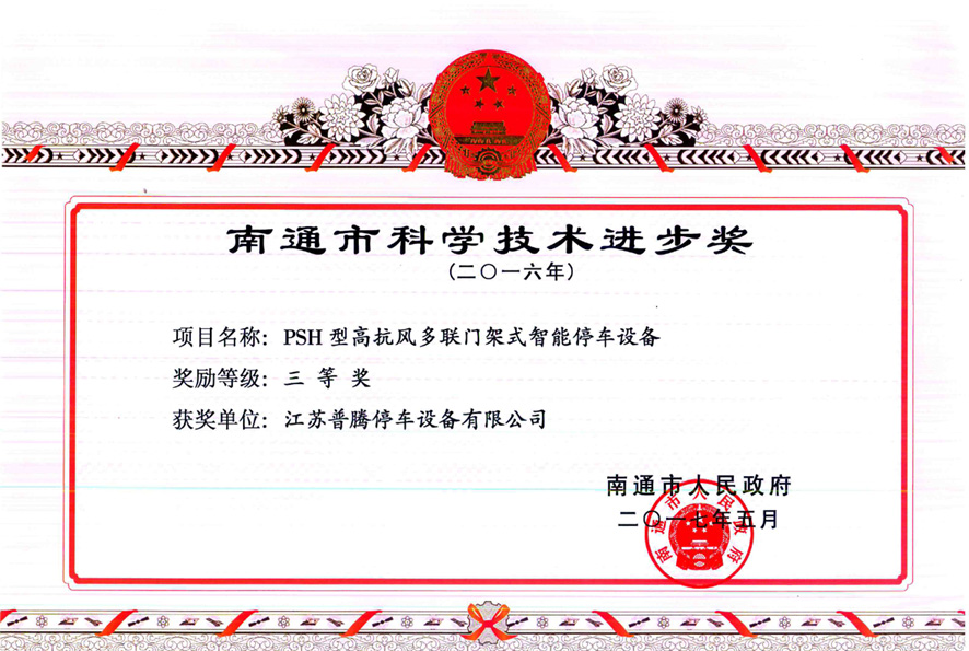 近日,子公司江蘇普騰又一項產品“PSH型高抗風多聯門架式智能停車設備”獲得由南通市人民政府頒布的2016年度“南通市科學技術進步獎”三等獎。該項殊榮的再次獲得,進一步肯定了公司在產品技術創新方面的工作,今后公司也將繼續加大新產品、新技術的研發力度,為市場提供更智能、更優質的停車設備產品。