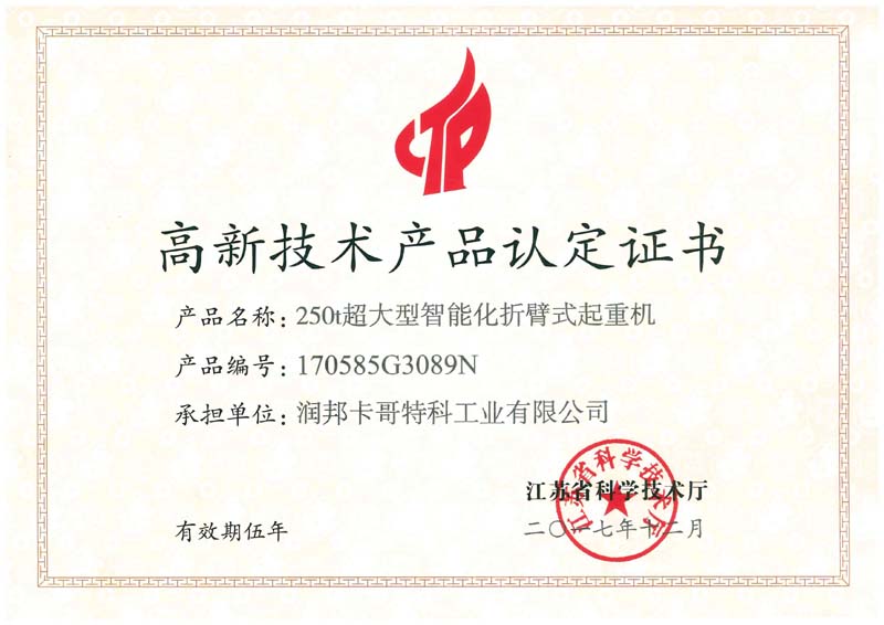 近日,由子公司潤邦卡哥特科研發(fā)的“250t超大型智能化折臂式起重機”項目再獲江蘇省科學(xué)技術(shù)廳高新技術(shù)產(chǎn)品認定證書。此項高新技術(shù)產(chǎn)品證書的獲得,是對潤邦卡哥特科科研創(chuàng)新能力的充分認可。潤邦卡哥特科將進一步提高自主創(chuàng)新能力,推進企業(yè)轉(zhuǎn)型升級。