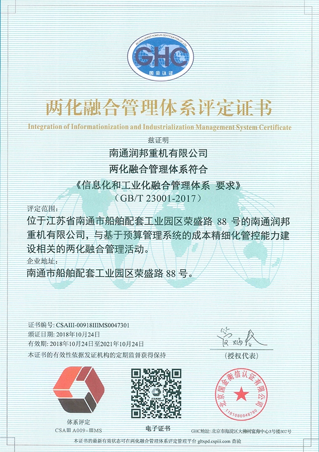 近日,經(jīng)國家工信部授權(quán)認(rèn)證機構(gòu)北京國金衡信認(rèn)證有限公司評估審核,潤邦重機順利通過了兩化融合管理體系認(rèn)定。