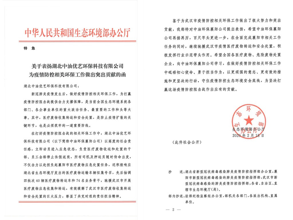 近日,潤邦股份旗下湖北中油優(yōu)藝環(huán)保科技有限公司(簡稱“中油環(huán)保”)收到生態(tài)環(huán)境部辦公廳所發(fā)特急函件,專項表揚(yáng)了中油環(huán)保在抗擊新冠肺炎疫情中所做的突出貢獻(xiàn)。
