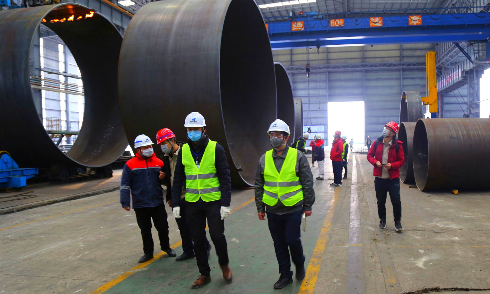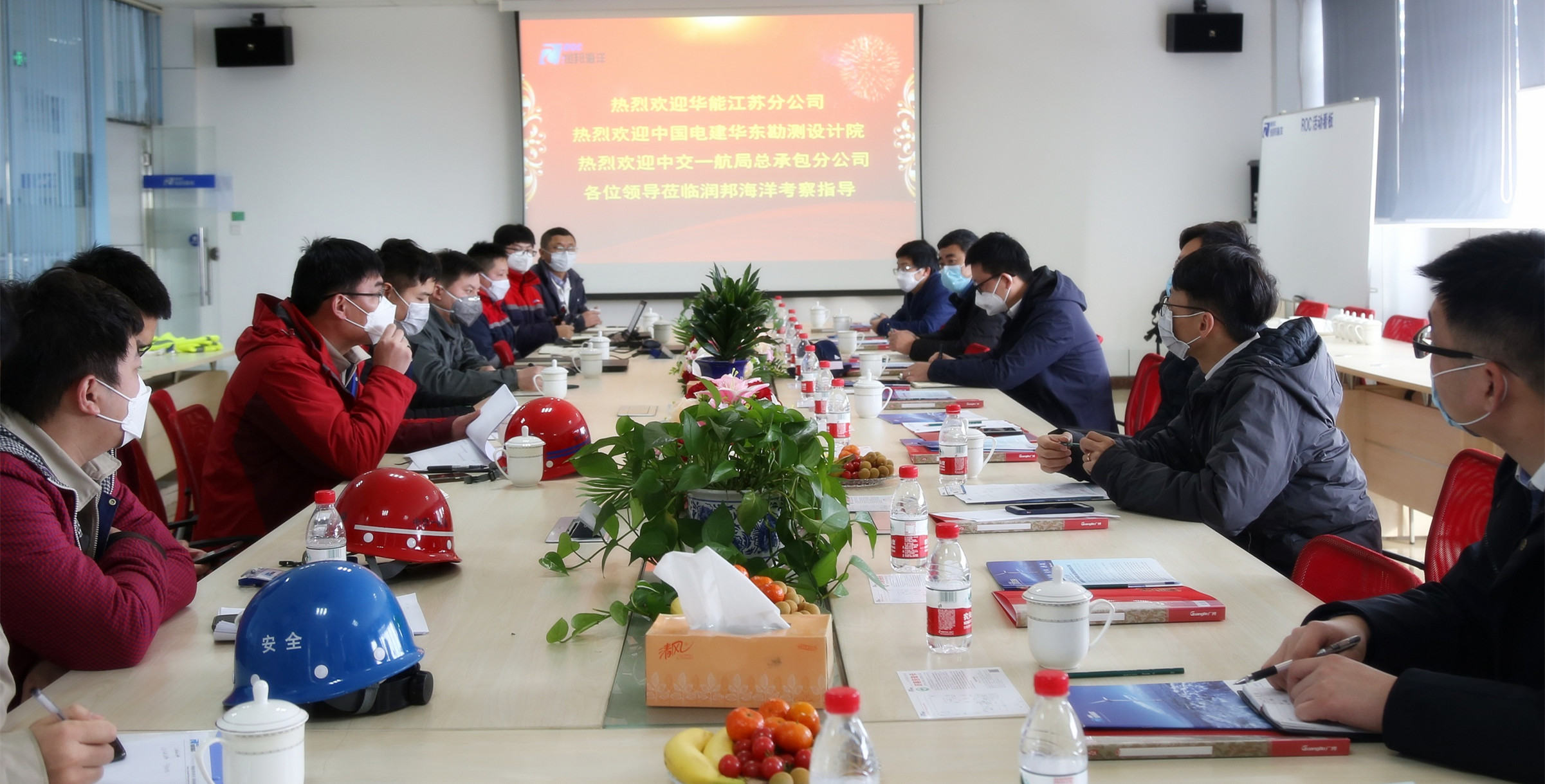 中國華能集團有限公司江蘇分公司領導陸界屹先生、華東勘測設計研究院有限公司水利與新能源事業部總經理陳大江先生、中交一航局啟東項目部副經理李春雷先生等一行赴潤邦海洋實地調研潤邦海洋復工復產情況,共同協商對策以加快推進啟東風場項目進展。