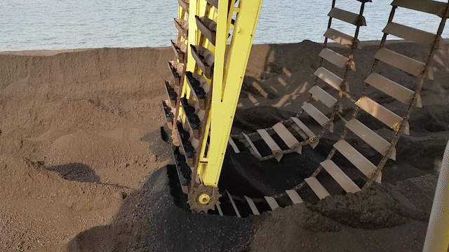 GENMA懸鏈斗卸船機設計效率為2x800t/h,采用多排鏈控制,具有靈活高效和卸船穩定等特點。GENMA懸鏈斗卸船機對水面風浪敏感度低,駁船因風浪上下顛簸時,卸船機取料部分不會因為與船艙碰撞而損壞,提高了設備的環境適應能力。