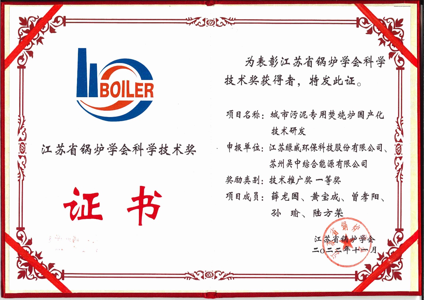 近日,2022年江蘇省鍋爐學會“科學技術獎”評審結果公示,潤邦股份旗下綠威環保與蘇州吳中綜合能源有限公司聯合申報的“城市污泥專用焚燒爐國產化技術研發”榮獲技術推廣獎一等獎。