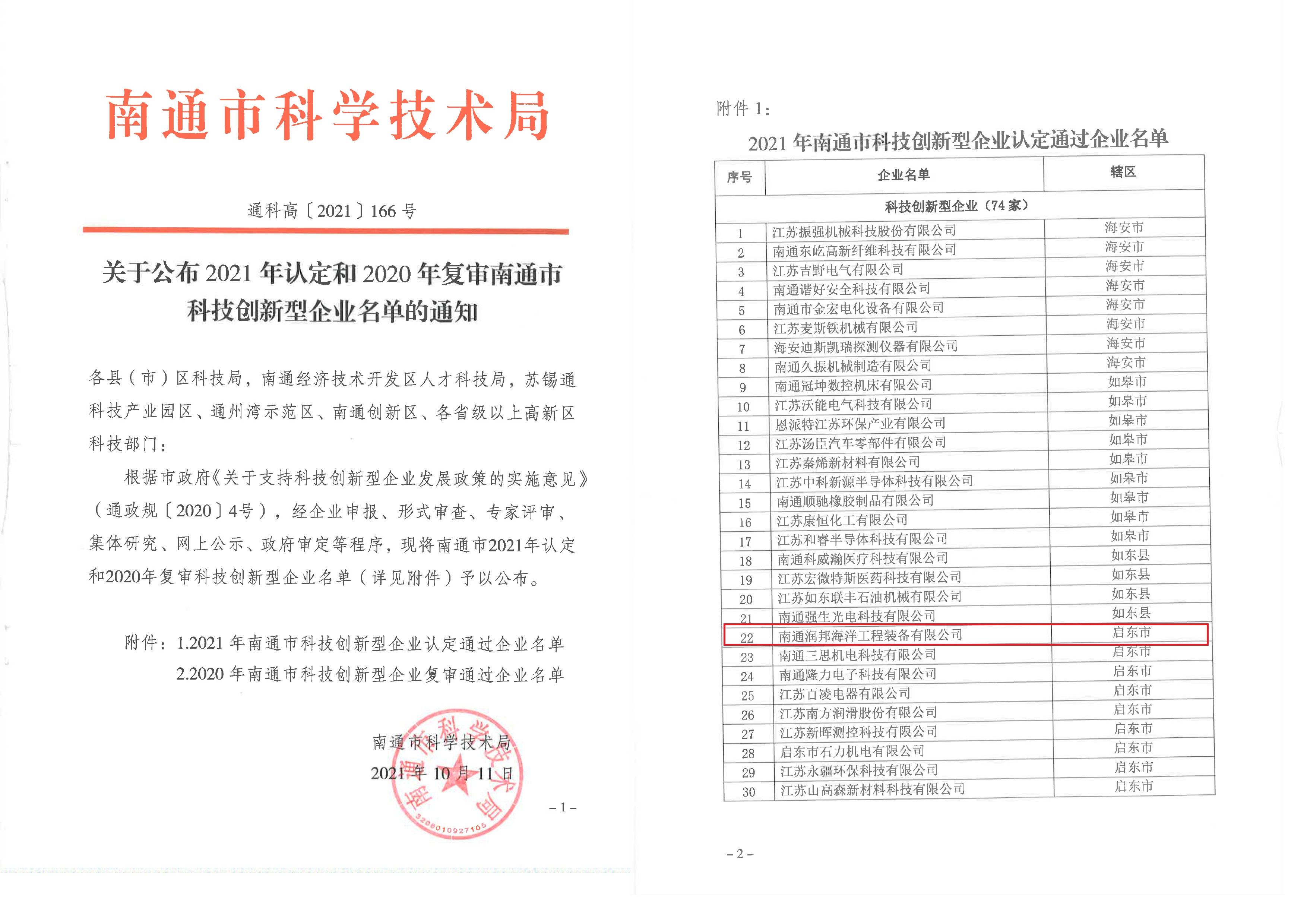 近日,南通市科學技術(shù)局發(fā)布了《關(guān)于公布2021年認定和2020年復審南通市科技創(chuàng)新型企業(yè)名單的通知》,子公司潤邦海洋榜上有名!榮獲“南通市科技創(chuàng)新型企業(yè)”榮譽稱號,這是潤邦海洋在“秉承創(chuàng)新的技術(shù)為顧客創(chuàng)造價值”的企業(yè)使命,不斷提...