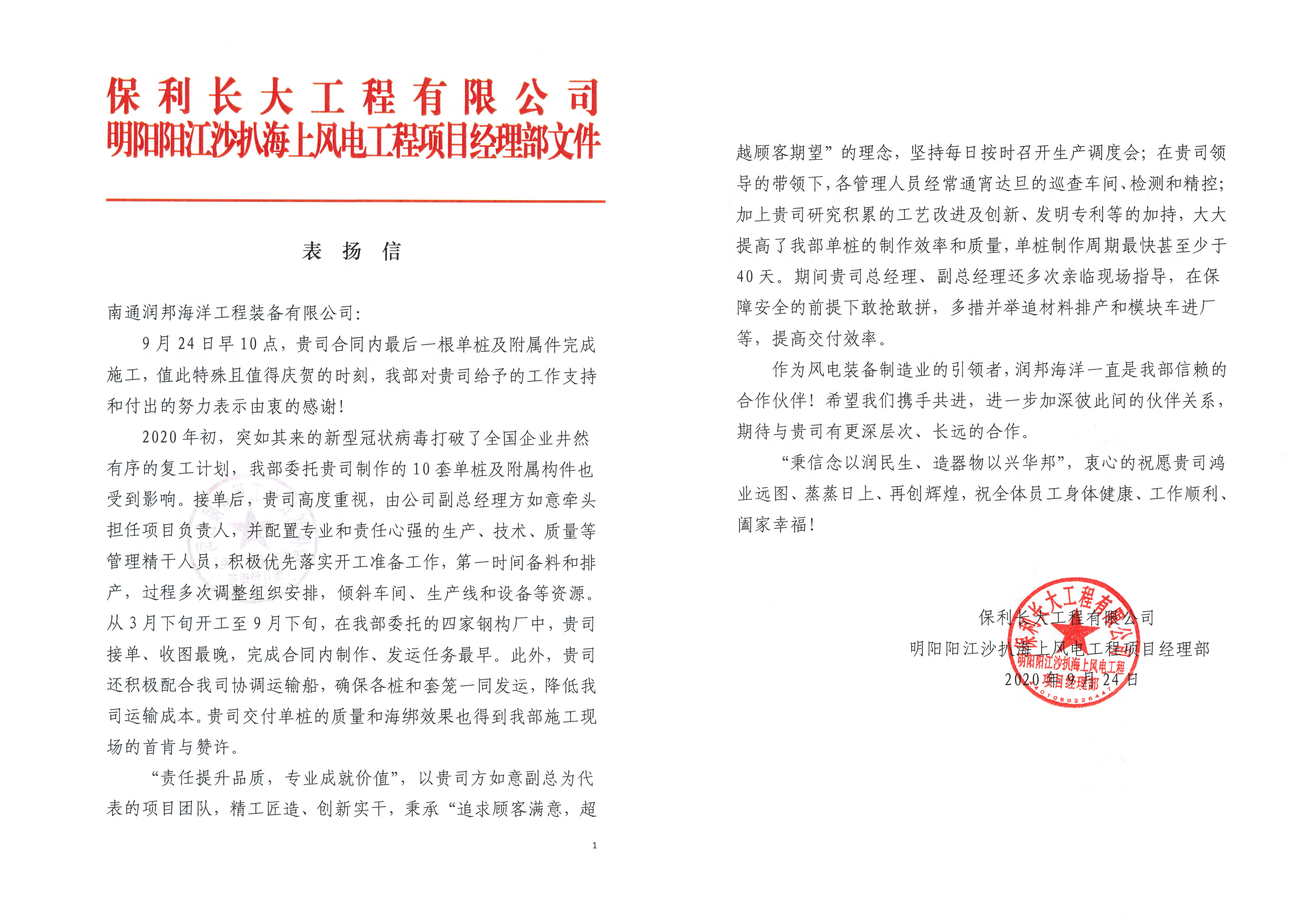 近日,子公司潤邦海洋收到客戶保利長大工程有限公司的表揚信,客戶在信中充分肯定了潤邦海洋的管理能力和項目建造能力。