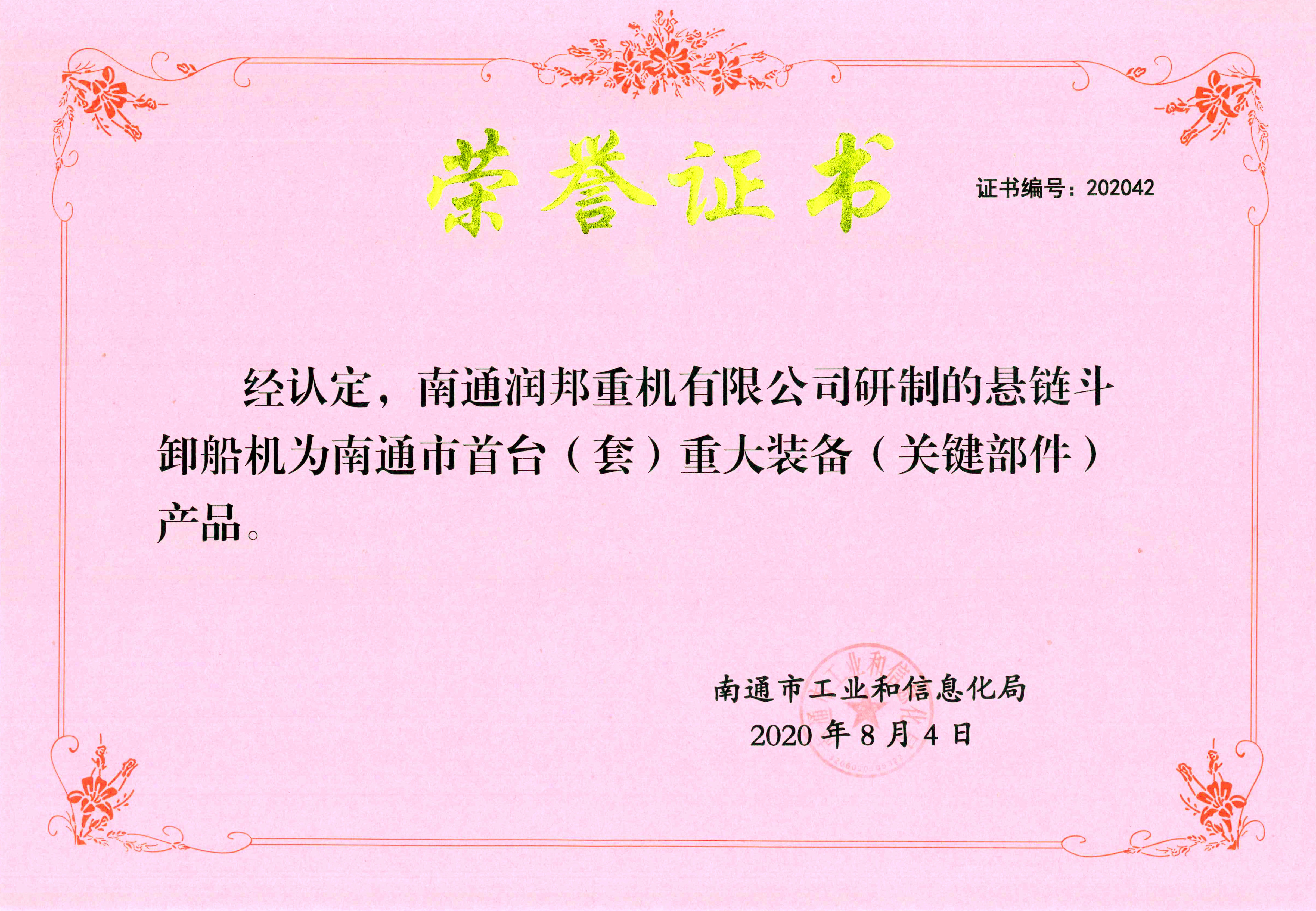近日,公司自主品牌“GENMA”懸鏈斗卸船機被南通市工業和信息化局認定為“南通市首臺(套)重大裝備(關鍵部件)產品”,該榮譽的取得充分體現了潤邦重機在散料輸送作業方面的研發創新能力。