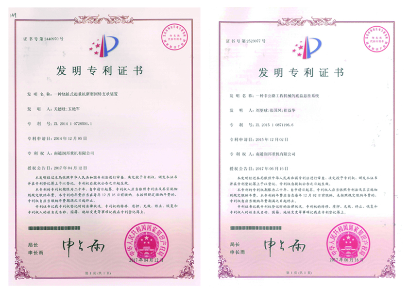 近期,潤(rùn)邦重機(jī)獲得了由國家知識(shí)產(chǎn)權(quán)局授權(quán)的兩項(xiàng)發(fā)明專利證書,分別為“一種繞樁式起重機(jī)新型回轉(zhuǎn)支承裝置”和“一種非公路工程機(jī)械的底盤懸掛系統(tǒng)”,標(biāo)志著公司在海洋工程裝備和港口機(jī)械領(lǐng)域取得了新的技術(shù)突破。
