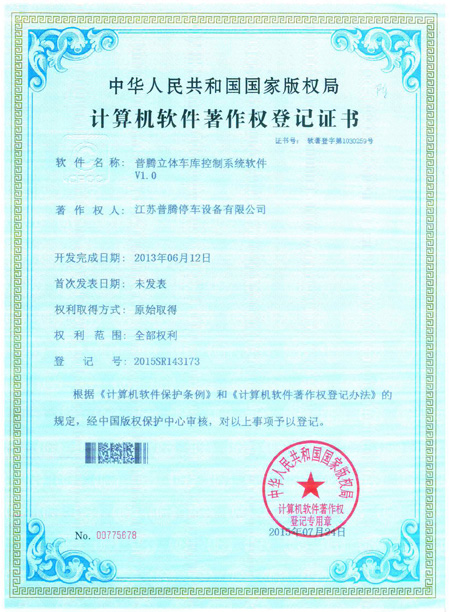 近期,江蘇普騰獲得了“普騰立體車庫控制系統軟件V1.0”的首個著作權登記證書,該證書的獲取標志著江蘇普騰已擁有自主知識產權的自動控制系統技術。