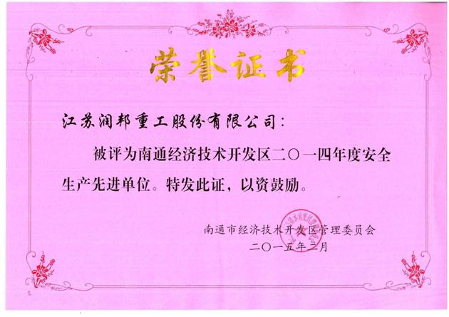 近日,江蘇潤(rùn)邦重工股份有限公司被南通經(jīng)濟(jì)技術(shù)開(kāi)發(fā)區(qū)管理委員會(huì)評(píng)為“二0一四年度安全生產(chǎn)先進(jìn)單位”。