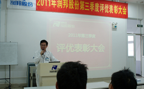 2011年10月14日下午,潤邦股份舉行了2011年第三季度評優表彰大會。 安全環境部首先做了安全工作報告,指出年關將近,公司的安全工作愈加突顯重要,隨后頒發了安全標兵及先進班組獎。接著,品質部、生產部分別做了品質報告和生產報...