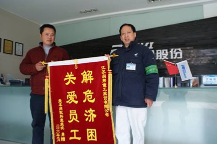 3月29日上午,一車間配料一組員工沈勇將一面寫有“解危濟困 關(guān)愛員工”的錦旗送到工會主席陳南山手中,今年2月6日公司員工迎新晚會中,公司常務(wù)副總經(jīng)理孫建成、工會主席陳南山發(fā)動公司全體員工為身患重病的員工沈勇捐款,幫助沈勇渡過難...