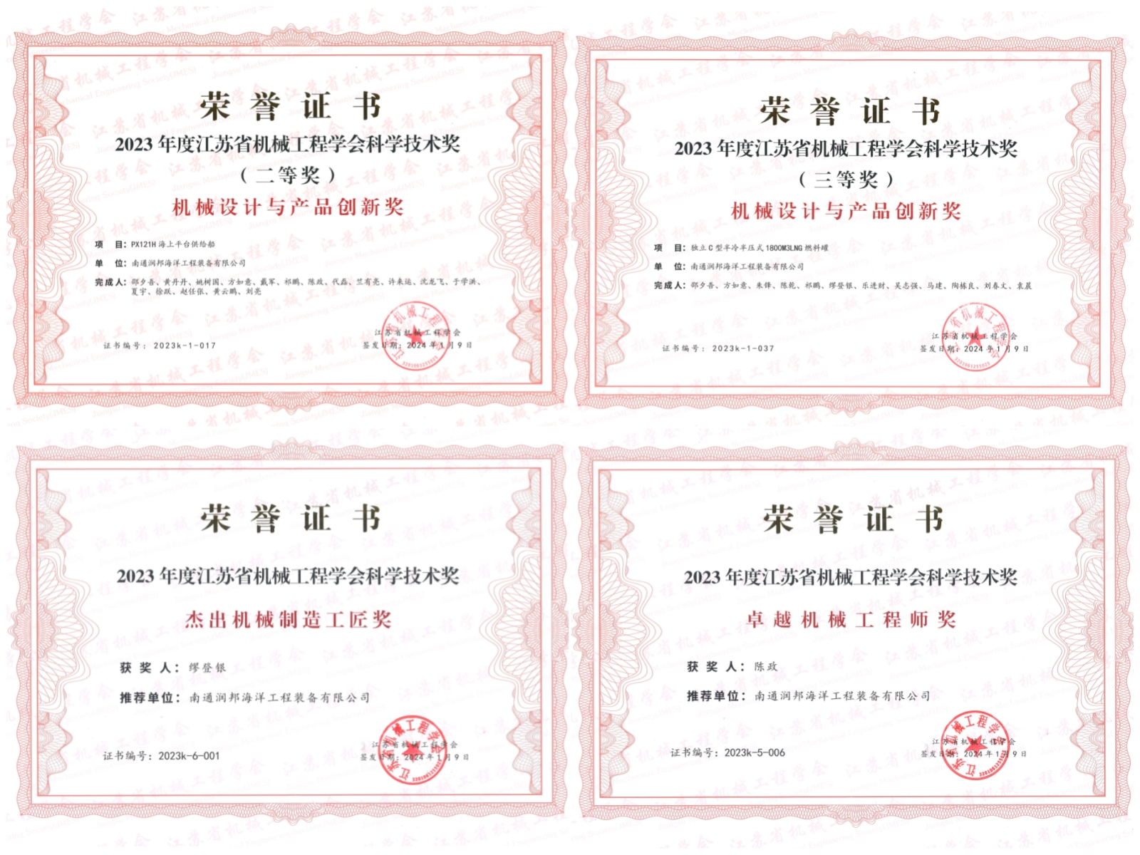近期,子公司潤邦海洋喜獲江蘇省機械工程學會頒發的四項榮譽證書,其中“PX121H海上平臺供給船”項目榮獲“機械設計與產品創新獎二等獎”,“獨立C型半冷半壓式1800M3LNG燃料罐”項目榮獲“機械設計與產品創新獎三等獎”;生產部繆登銀榮...